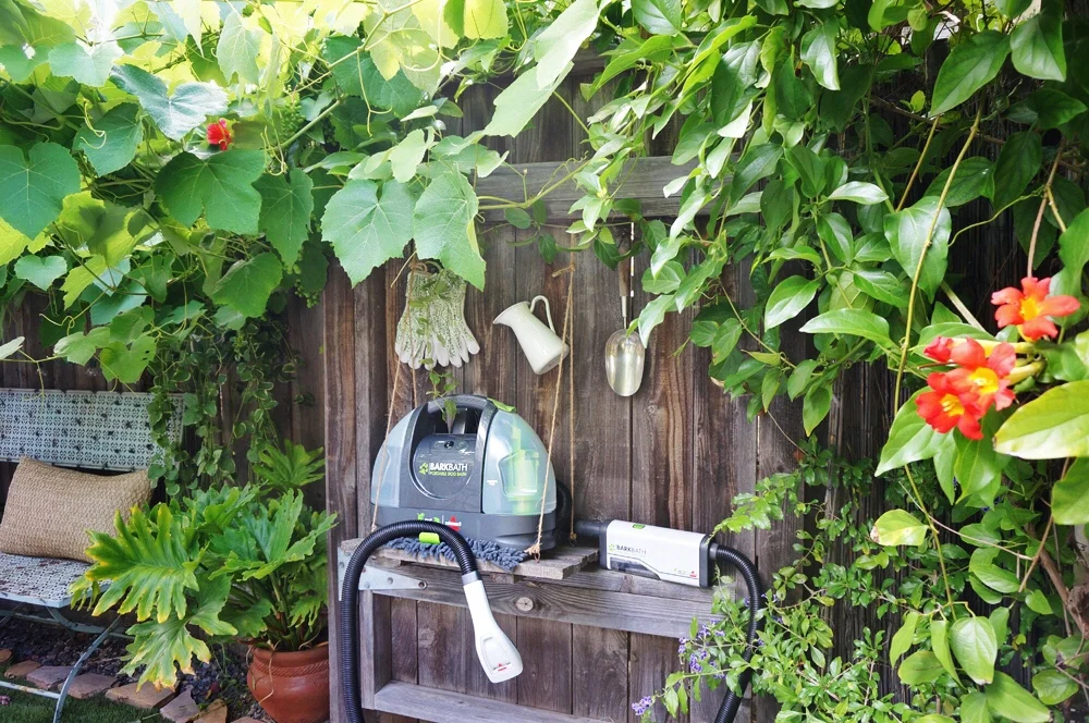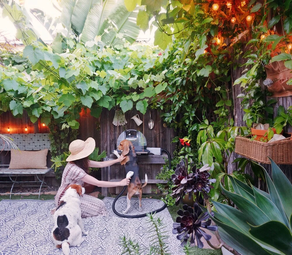 Frankly, we should bathe Stanlee and Sophee far more often than we do-- especially since we regularly take them to the beach and the dog park. But the last time we had the pups groomed here in LA it cost us around $120, and mildly traumatized them. Now that Adam and I are trying to save more of our income for West (and for some exciting plans here at the Cottage in the near future), we are searching for any way to cut back on spending. And since we're now both here at the Cottage all day long, it seems ridiculous to hire someone else to tackle a job that we could accomplish ourselves. While searching for a solution, BISSELL reached out to us with a product they suggested we try-- their BarkBath: