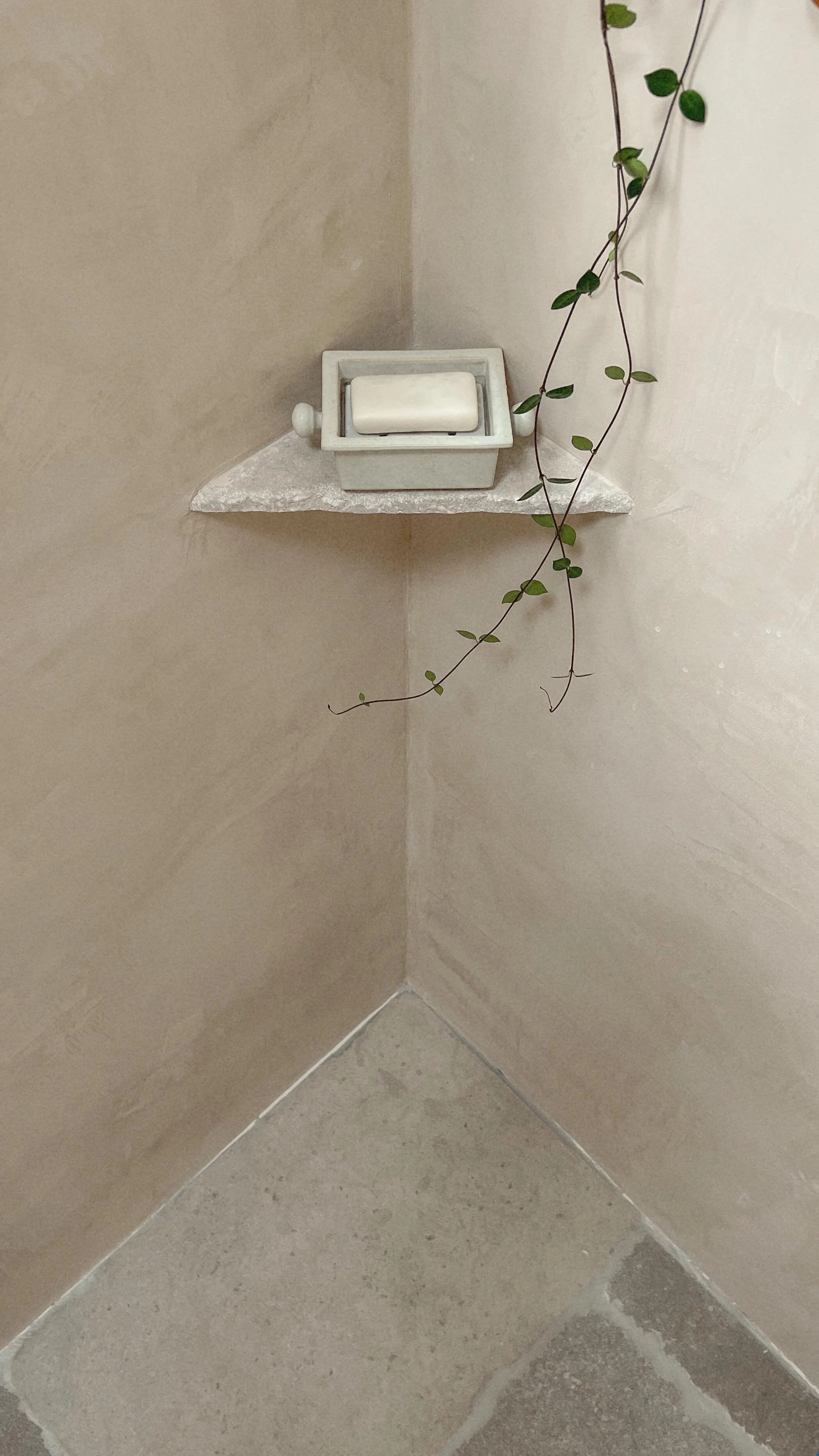 The sofa and shower feel like built-ins, so they’re more fitting for our Cottage, which is almost entirely furnished with wooden, built-in designs.